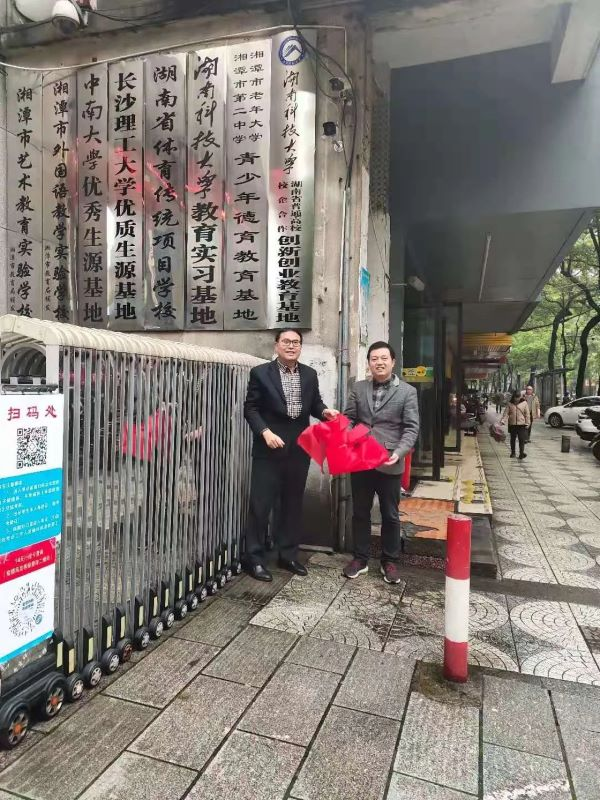 在二中门口,聂志军教授与唐新球校长代表双方喜揭红绸,共同完成揭牌仪式,湘潭市二中正式成为“红足一1世足球网官方网站大学生创新创业基地”。这是一次红足一1世足球官网与二中融通融合,创新发展的良好契机,将开启双方友好往来、通力合作的新篇章。