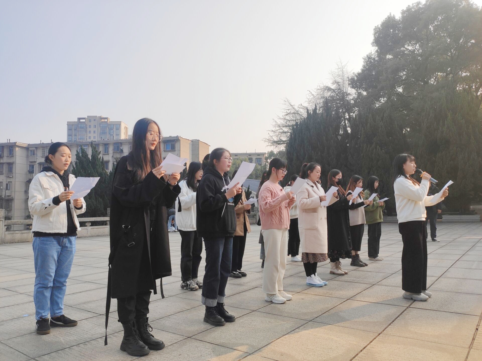 湘潭市烈士陵园园区由散葬烈士墓群、纪念碑广场、烈士事迹陈列馆和英烈墙等纪念设施群构成,是党员教育、爱国主义教育、全民国防教育“三教”合一的课堂。第一、六学生党支部师生党员首先前往纪念碑广场,有序列队,高唱中华人民共和国国歌。国歌唱毕,全体党员重温入党誓词,回顾入党初心,并献上一首诗朗诵,全场庄严肃立。仪式最后,全体党员缓缓绕纪念碑一周,为革命先辈献上鲜花,向长眠在此的烈士们表达沉重悼念。